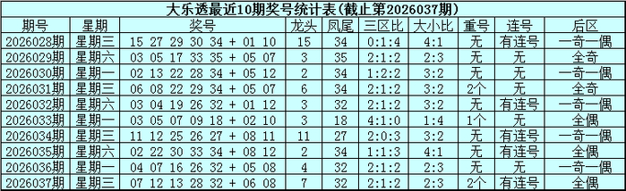 前区连号分析:上期前区包含连号,最近10期包含连号的奖号有5期,连号走势较冷,本期关注连号出现,参考连号33、34。